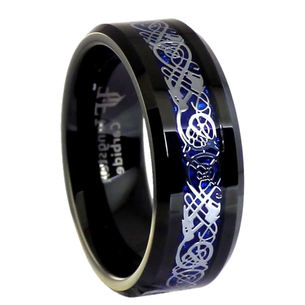Fabricado en acero quirúrgico, asegurando durabilidad y resistencia. Con detalles de dragones entrelazados.