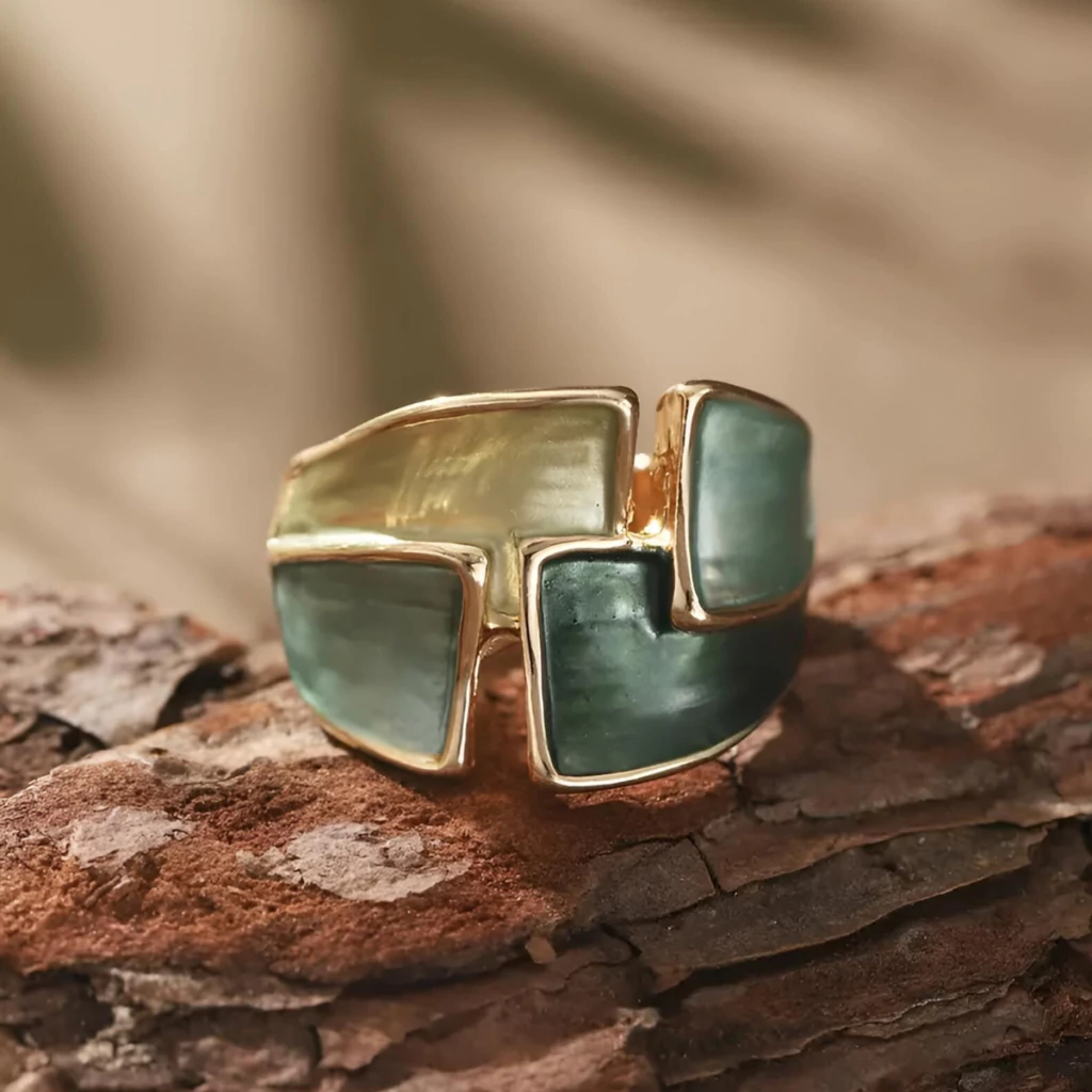 Este anillo combina un diseño contemporáneo con la esencia natural de los tonos verdes. Fabricado en aleación de zinc con recubrimiento dorado, presenta un acabado esmaltado brillante que resalta sus formas geométricas irregulares. Su estructura elástica ajustable brinda comodidad y se adapta fácilmente a distintos tamaños de dedo, manteniendo siempre un calce firme y elegante.