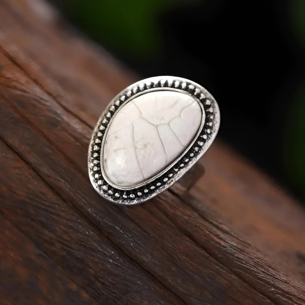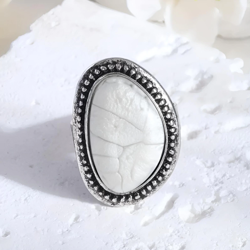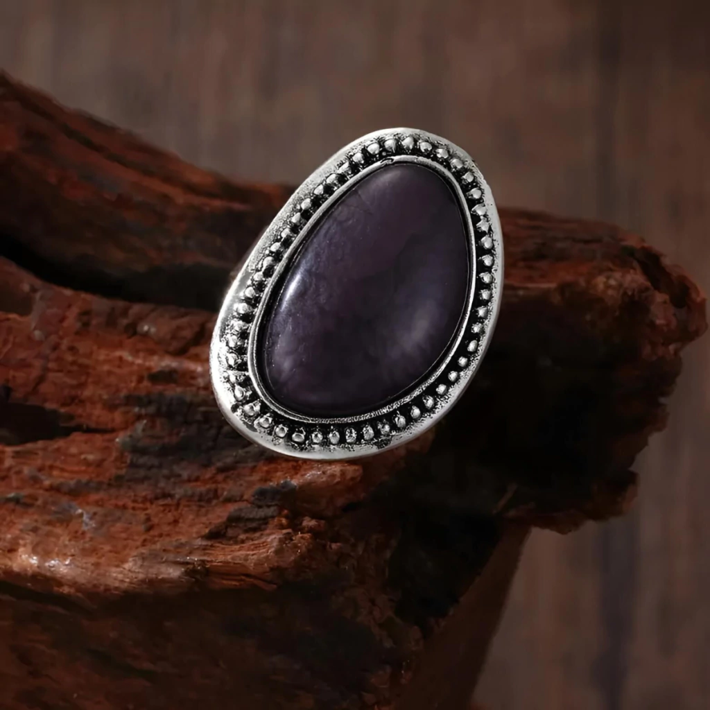 Este anillo combina la elegancia del diseño clásico con un toque moderno y distintivo. Fabricado en aleación de zinc con acabado metálico envejecido, presenta una piedra de resina con efecto marmolado que aporta profundidad y carácter a la pieza. Su contorno con pequeñas incrustaciones metálicas realza la forma y añade un brillo sutil que lo convierte en un accesorio protagonista.