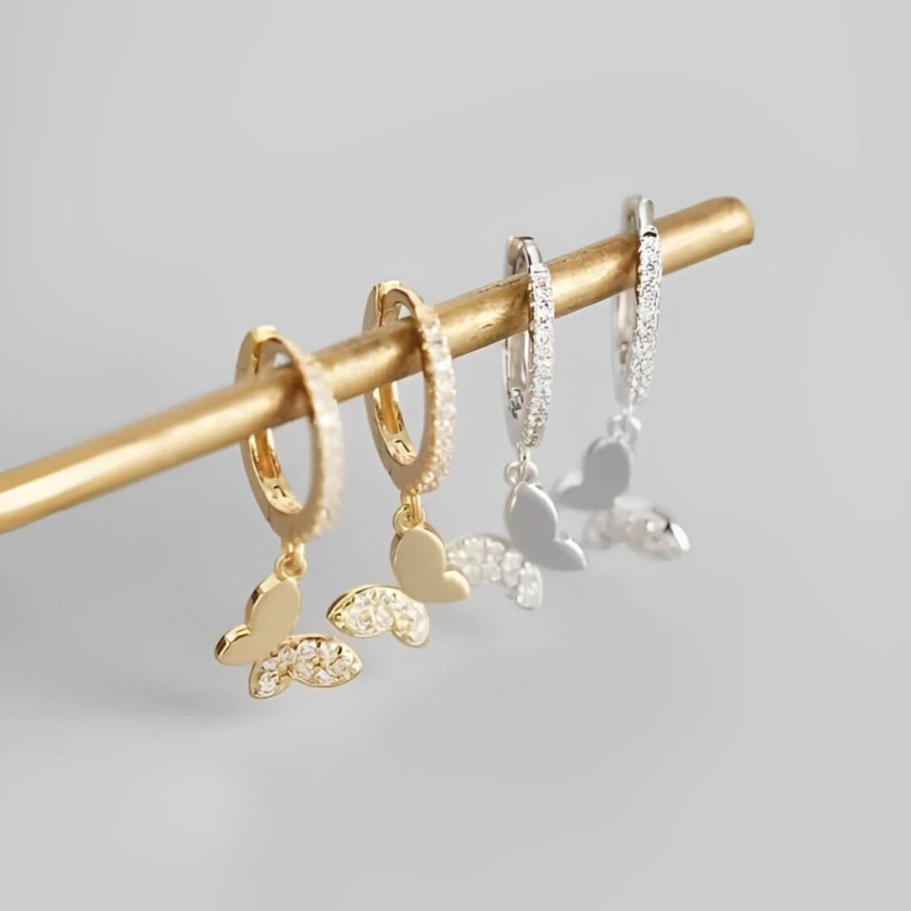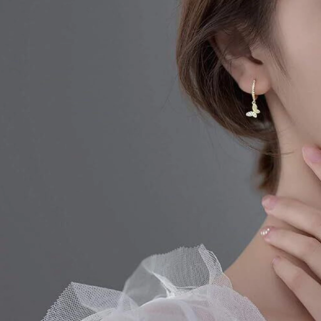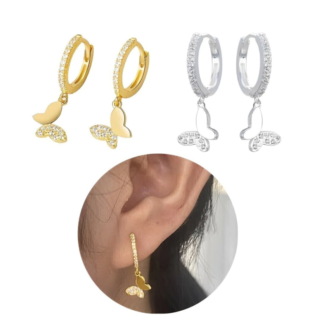 Realza tu estilo con estos hermosos aros de diseño minimalista y sofisticado. Con un dije en forma de mariposa delicadamente adornado con zirconias cúbicas, estos aros combinan brillo y elegancia, ideales para cualquier ocasión.
