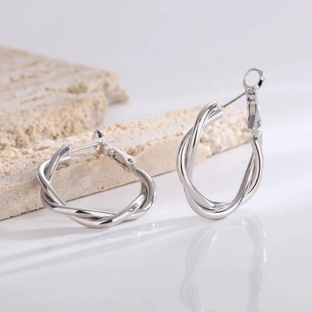 Estos aros de argolla plateados con un diseño trenzado destacan por su elegancia y originalidad. Perfectos para complementar tanto atuendos casuales como formales, aportan un toque moderno y sofisticado a tu look.