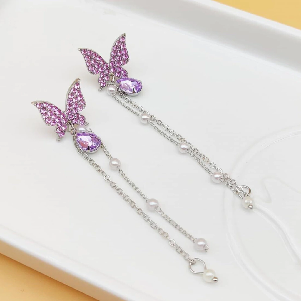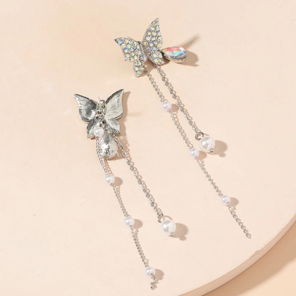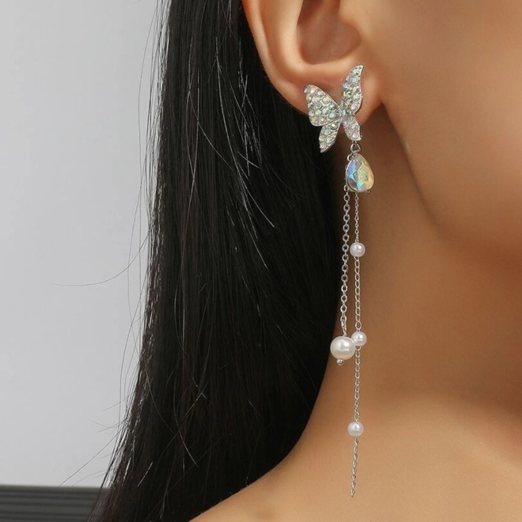Añadí un toque delicado a tu mirada con estos aros largos de mariposa. Decorados con strass brillantes, perlas y cadenas, son el accesorio perfecto para destacar con elegancia.