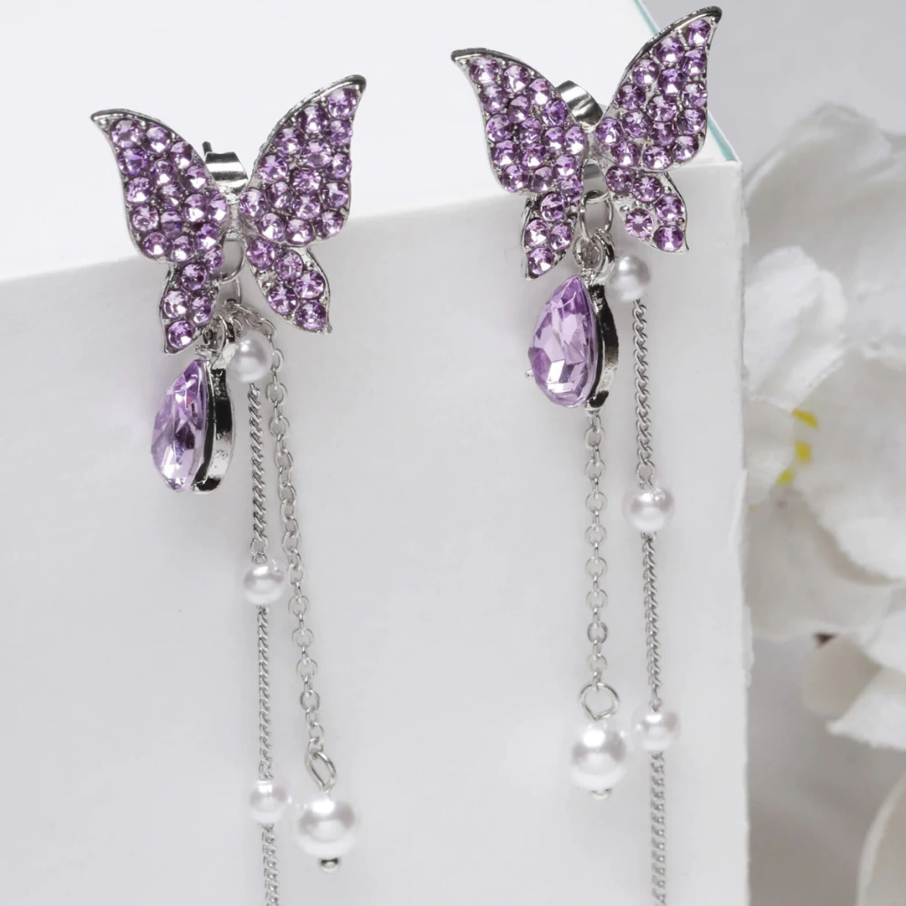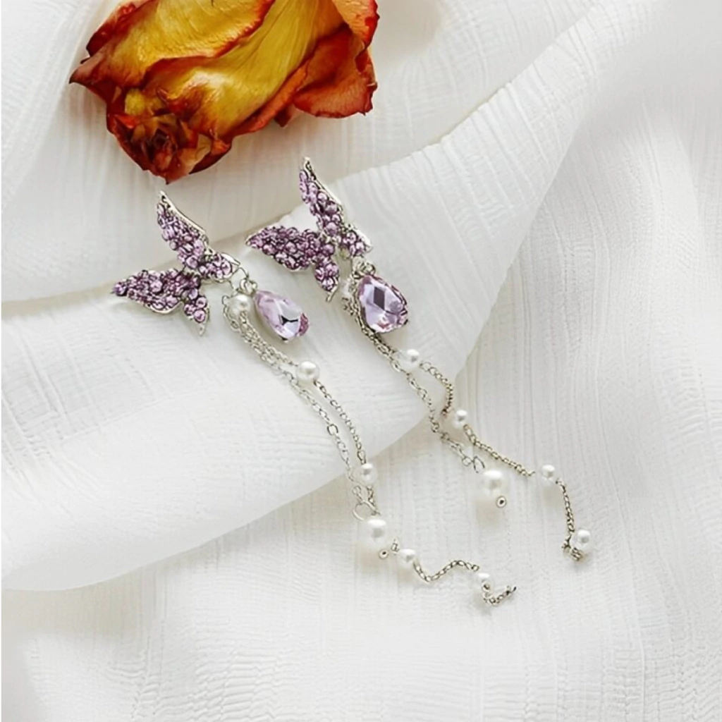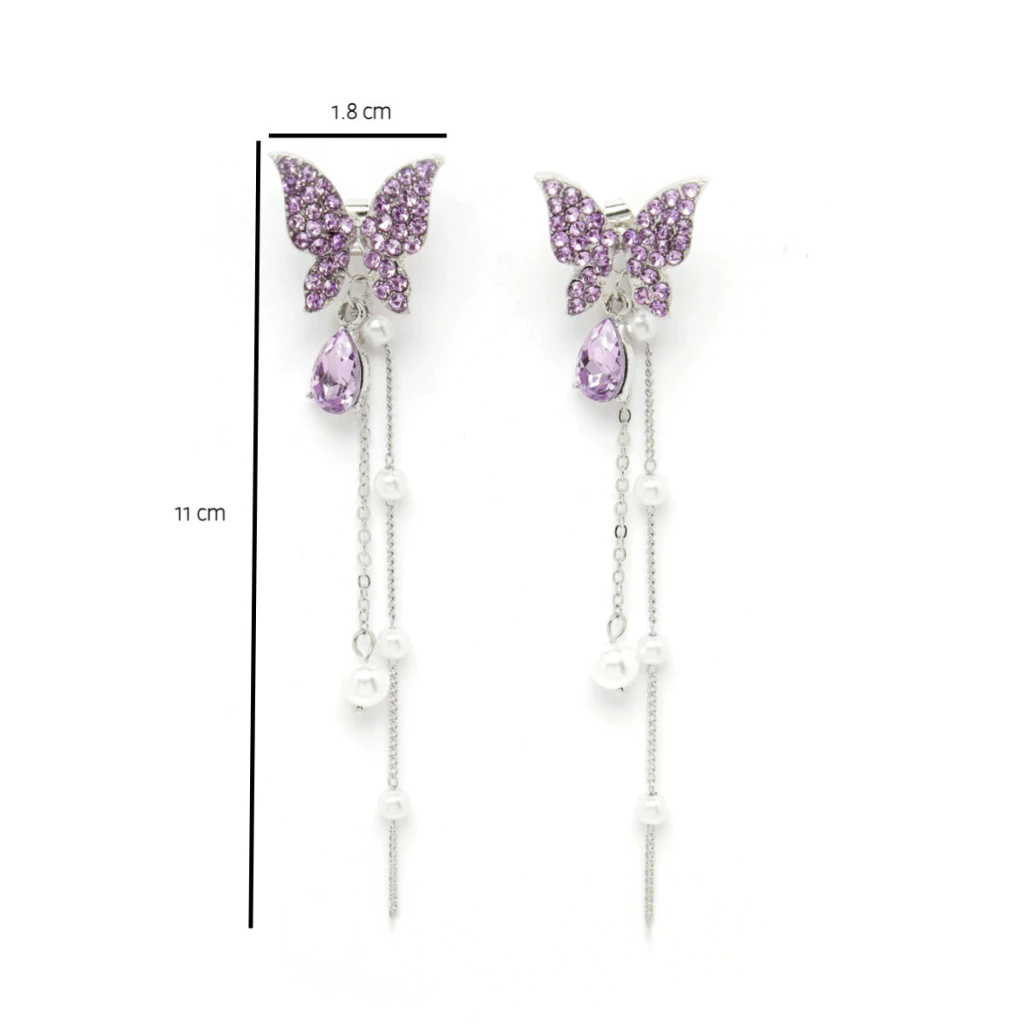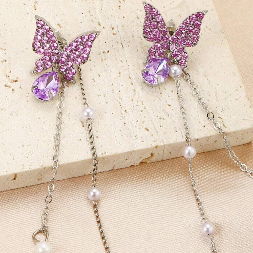 Añadí un toque delicado a tu mirada con estos aros largos de mariposa. Decorados con strass brillantes, perlas y cadenas, son el accesorio perfecto para destacar con elegancia.