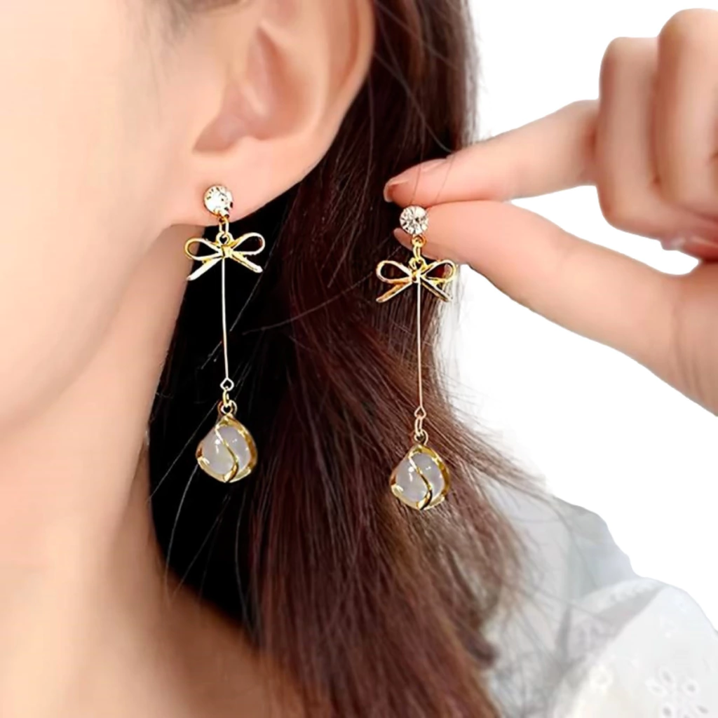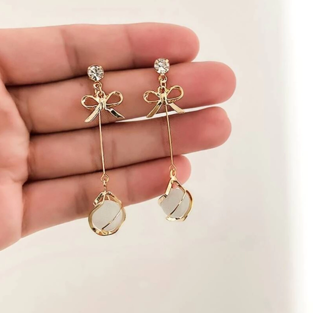 Encantadores aros colgantes que combinan un diseño delicado de lazo dorado con una perla sintética blanca marcada en detalle metálico. Fabricados en aleación dorada de alta calidad con circonita cúbica brillante en la base, aportan un toque romántico y cómodo.
