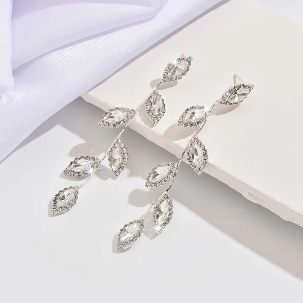 Brillá con estos aros únicos que combinan delicadeza y sofisticación. Su diseño alargado con hojas cristalinas engastadas en circonita cúbica refleja la luz a cada movimiento, realzando tu estilo en cualquier ocasión.
