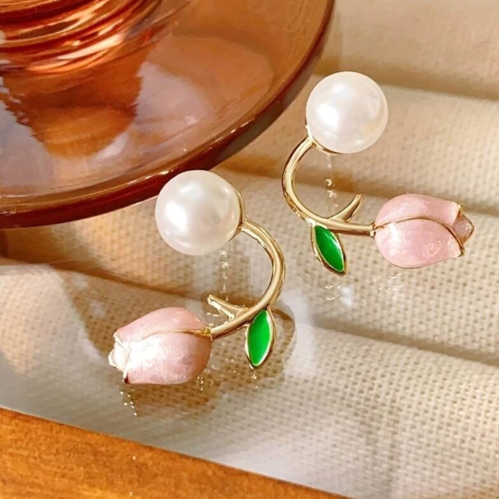 Hermosos aros con diseño de rosas delicadas y perlas brillantes que aportan un toque romántico y elegante. Fabricados en aleación dorada de alta calidad con detalles en esmalte pintado a mano y perlas sintéticas.