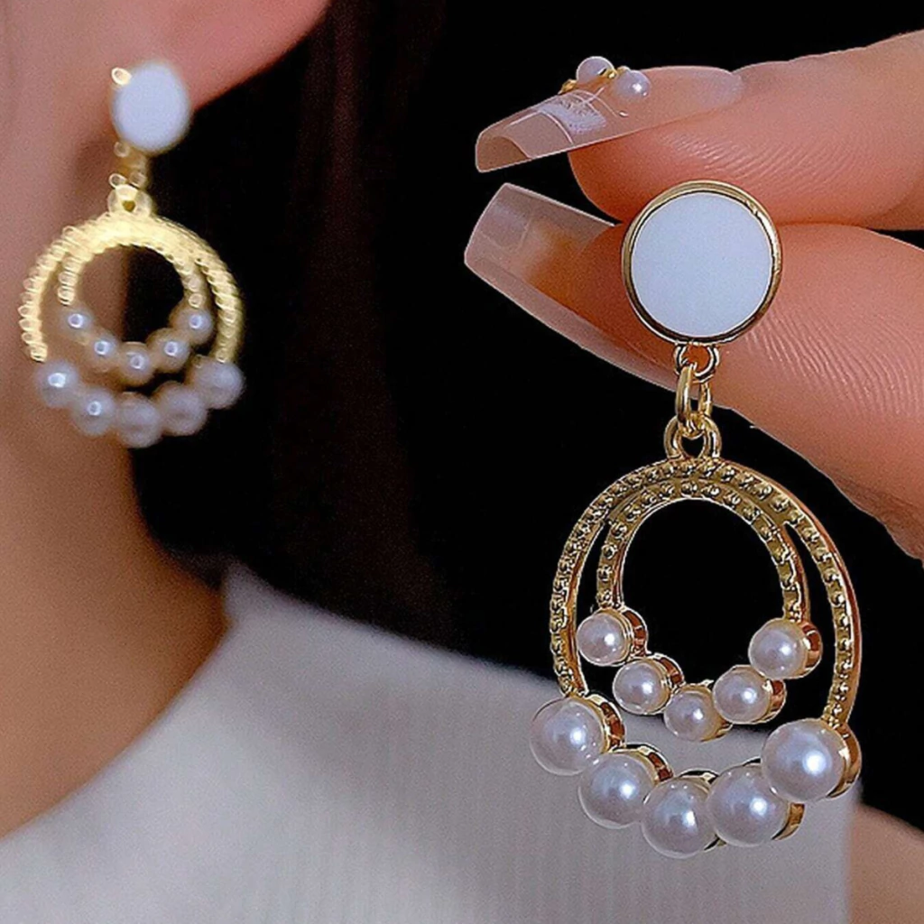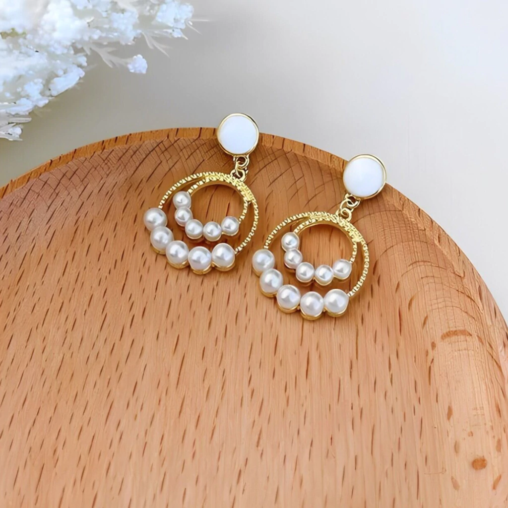 Estos aros colgantes dorados combinan elegancia y modernidad con detalles de perlas colgantes en un diseño circular. Perfectos para eventos formales o para darle un toque refinado a tu look diario, estos aros realzan tu estilo con un aire sofisticado y femenino.
