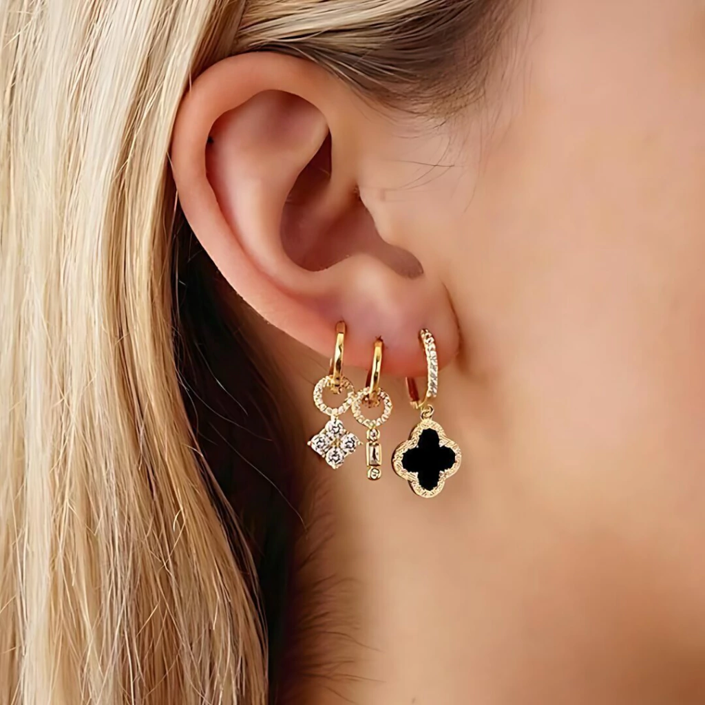 Descubrí estos elegantes aros colgantes, diseñados para quienes buscan un toque de distinción y buena energía en su look diario. Cada aro presenta un delicado trébol de la suerte, símbolo universal de protección y prosperidad, adornado con brillantes circonitas que aportan un sutil brillo.
