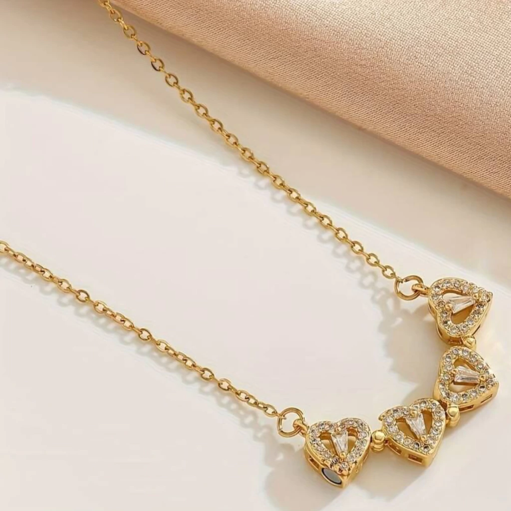 Este delicado collar combina corazones brillantes en un elegante diseño dorado, ideal para cualquier ocasión especial. Fabricado en acero y adornado con detalles de brillantes, es perfecto para destacar con un toque romántico y sofisticado.