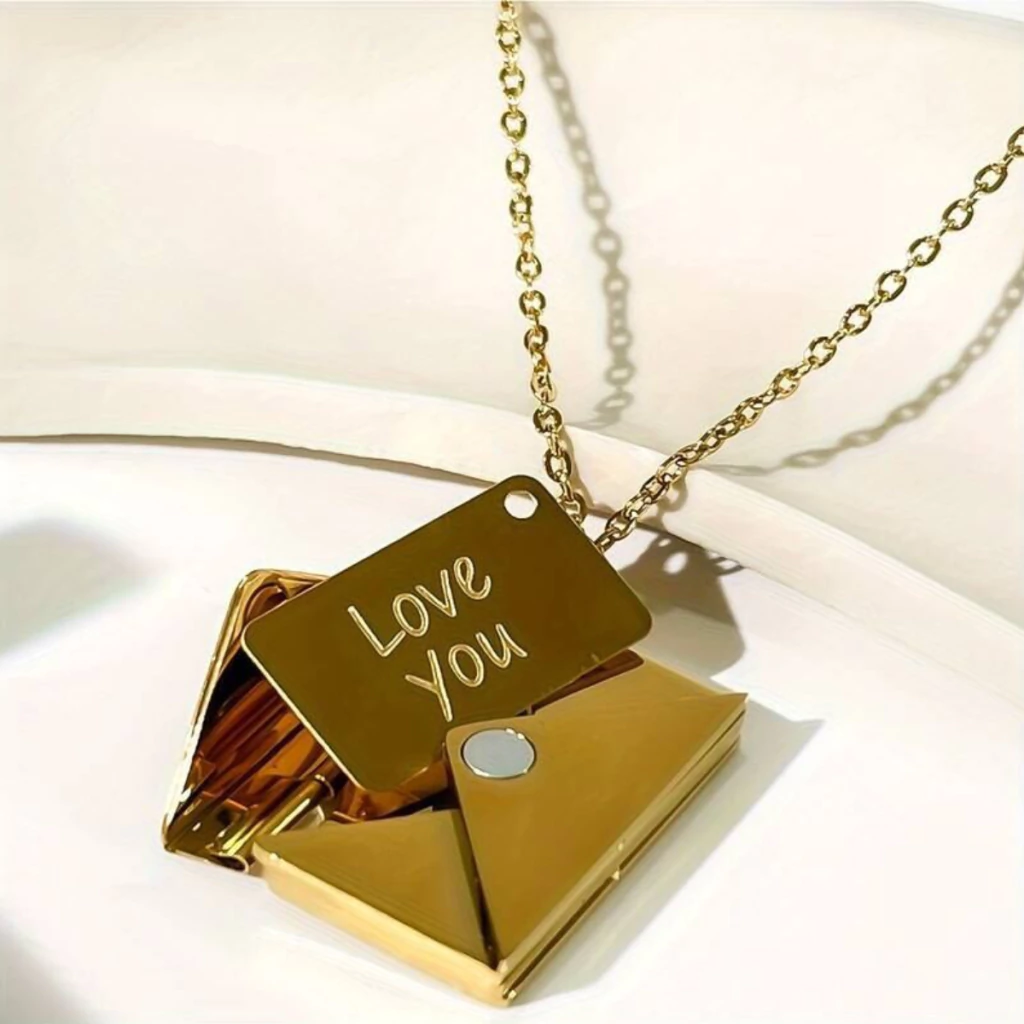 Este elegante collar con un dije en forma de sobre incluye una placa con el grabado "Love You". Fabricado en acero quirúrgico con un delicado acabado dorado, es el regalo perfecto para expresar amor de una manera única y especial. ¡Ideal para sorprender a esa persona especial!