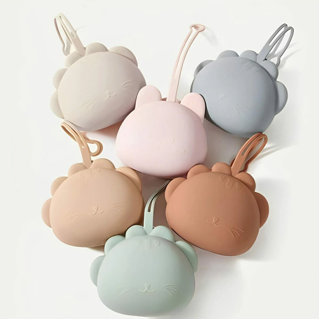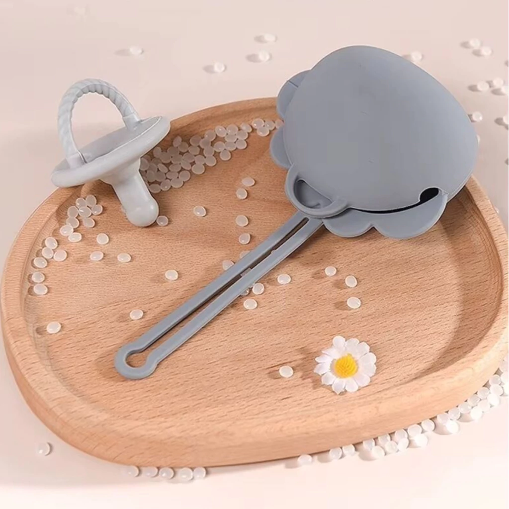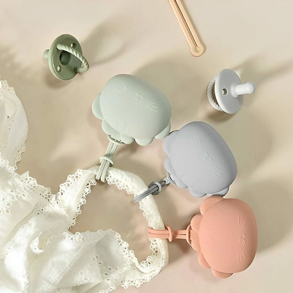 Porta Chupete de Silicona en dos encantadores diseños. Ambos modelos cuentan con una práctica tira para colgar y transportar, ideal para mantener el chupete siempre a mano y limpio.