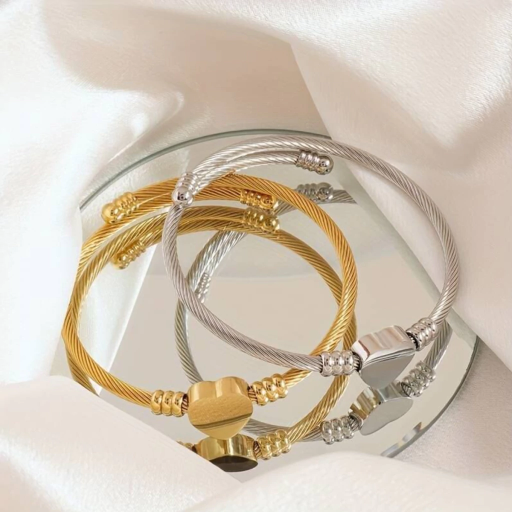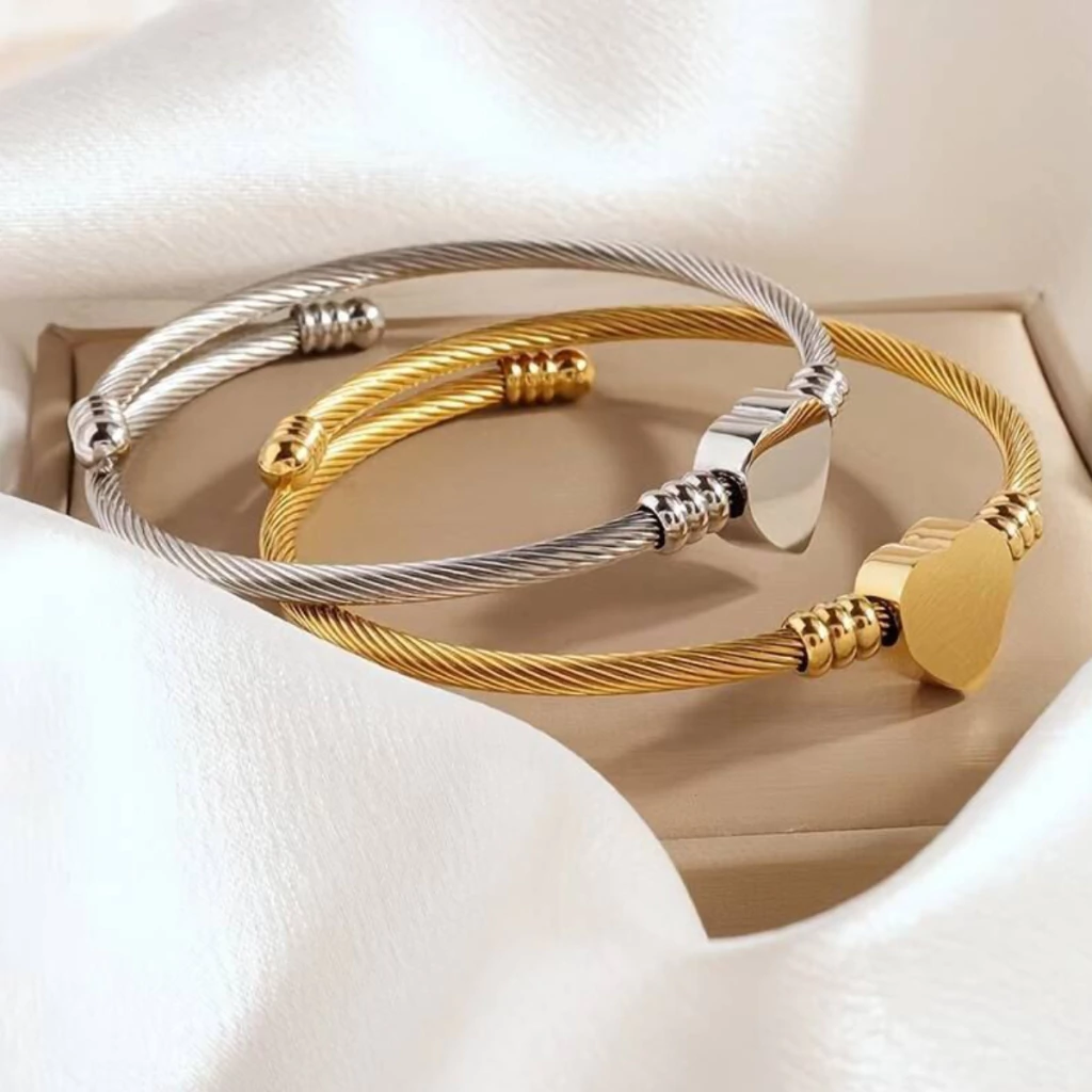 Sumá elegancia y estilo a tu outfit con estas pulseras de acero inoxidable en colores dorado y plateado. Con un diseño minimalista y un dije corazón, estas pulseras son el complemento perfecto para quienes buscan un accesorio delicado y moderno. Disponibles en ambos colores, ideales para cualquier ocasión.