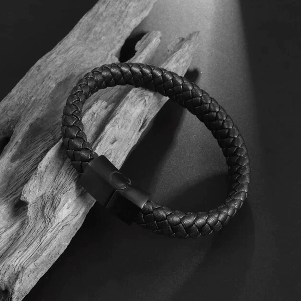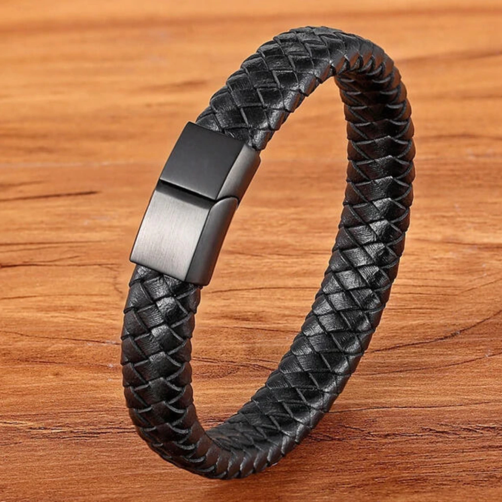 Pulsera Hombre Ecocuero Negro Trenzado con Cierre Clip. Este accesorio está diseñado para el hombre moderno que busca un toque distintivo en su estilo diario.
