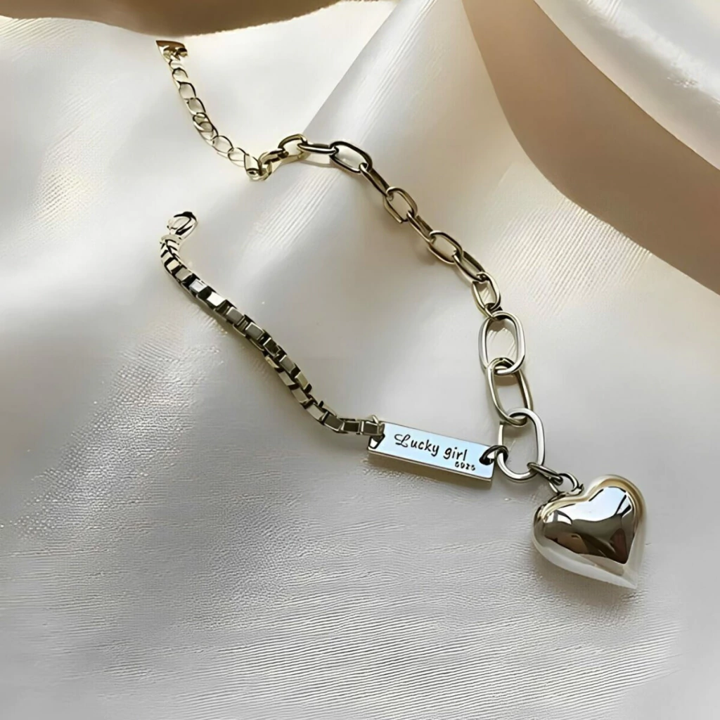 Diseño: Cadena combinada con placa grabada y dije colgante en forma de corazón.