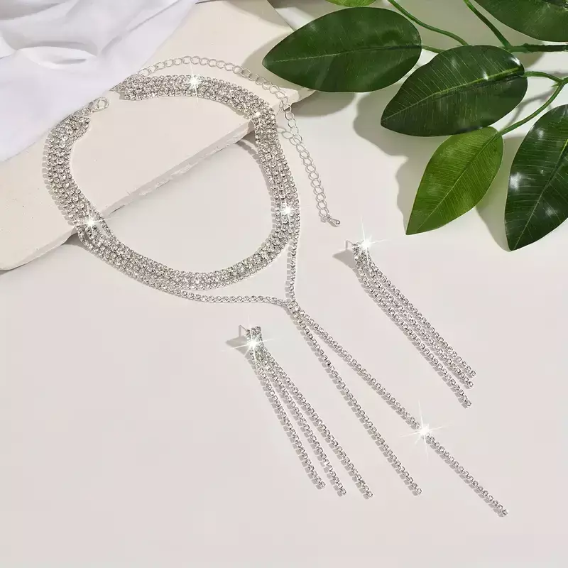 Descubrí el toque de distinción perfecto para tus eventos especiales con este set exclusivo que combina un collar lariat con aros largos, ambos decorados con brillantes strass que capturan la luz y todas las miradas.