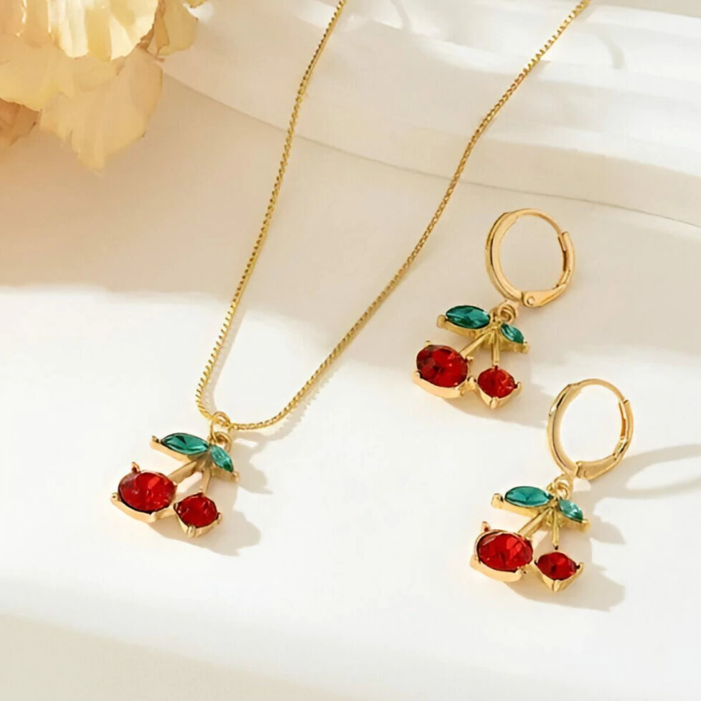 Set Collar y Aros con Dije de Cerezas en Cristal Rojo Descubrí la elegancia y el encanto en cada detalle con este exclusivo set de collar y aros. El delicado dije de cerezas, elaborado en cristal rojo brillante, aporta un toque fresco y vibrante a tu look, ideal para cualquier ocasión.