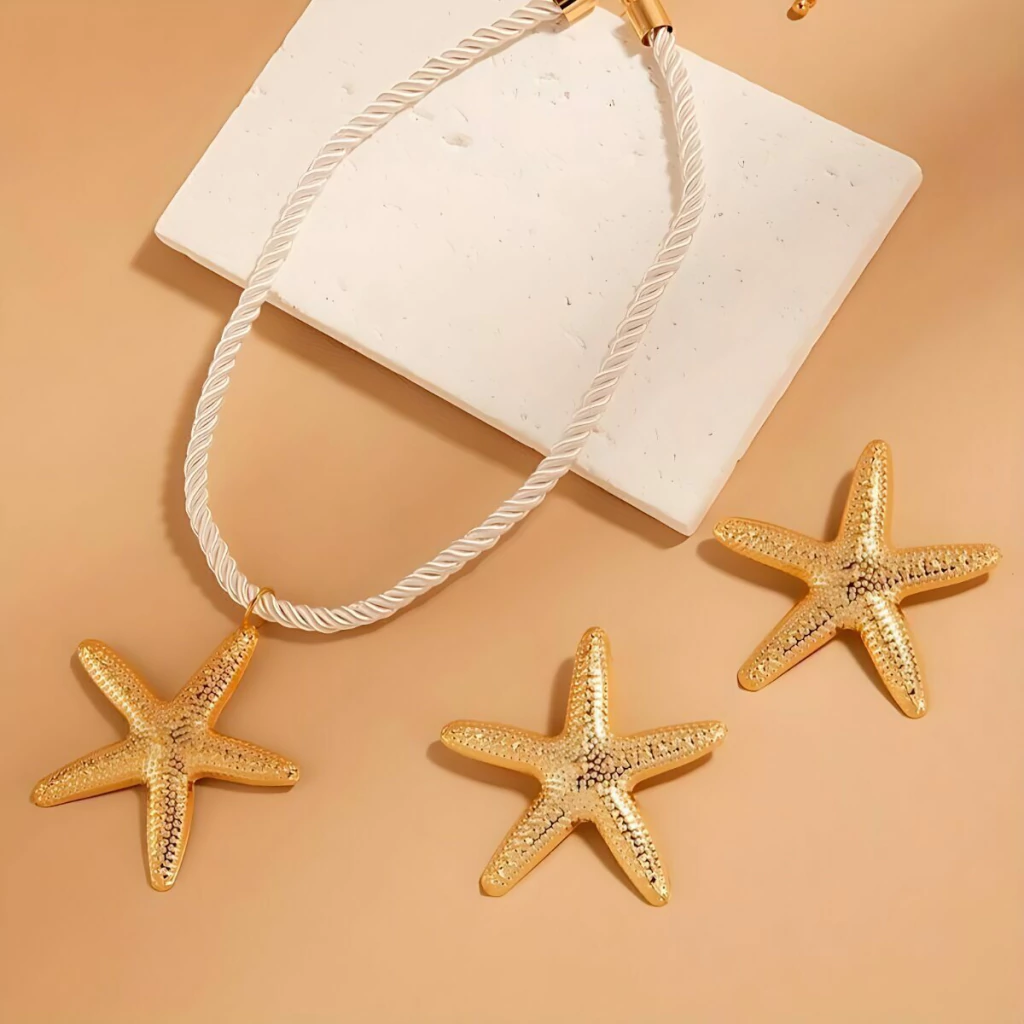 Cada pieza refleja la belleza natural del océano, con detalles delicados que capturan la esencia de la estrella de mar. El collar y los aros están elaborados con materiales de alta calidad, garantizando durabilidad y un acabado impecable.